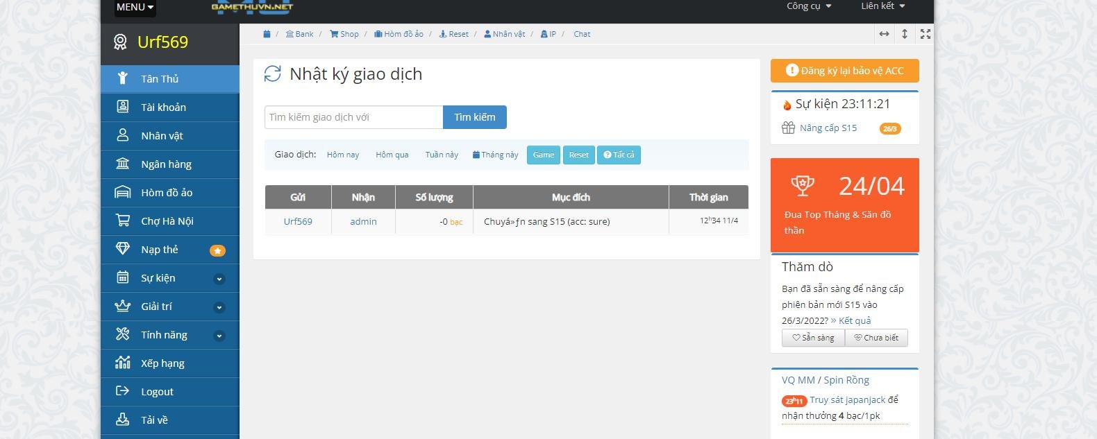 Ngày 11-4-2022 Mình có chuyển 9090 bạc vào nv: admin ở s15 và có ghi chú trả bạc cho acc: Urf569 ở s12 như ad hướng dẫn ở zalo Xong đấy mình có đc mở khóa và đã tạo acc: sure để chuyển nv và đồ đã sang. Lúc sang đã mất 1 con SHK+15 với 1 con TM mình đã thắc mắc và không có câu trả lời gì. Rồi xong 1 ngày đẹp trời nào đó hiện tại là ngày 19-4 mình có kiểm tra lại thông tin bên s15 và vẫn bị gán cái án nợ bạc chưa trả. Mình đã cố hết sức nt qua zalo rồi sms vẫn ko có câu TL từ fan ko biết nay sếp có đi massger hay nhậu nhẹt đâu không mà lâu rep thế )