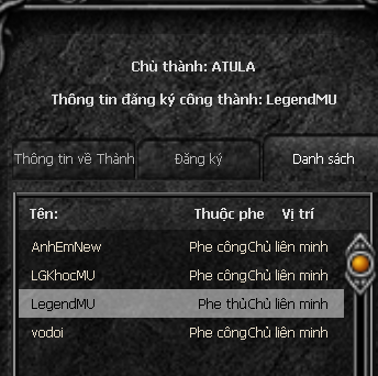 Công thành chiến tháng 8, guild AnhEmNew do nộp rena ít hơn các guild còn lại nên đã bị loại. Tham gia sự kiện chỉ có 4 guild LegendMU, LGkhocMU, VoDoi, ChayCoi Tuy nhiên, để không khí buổi công thành tối nay thêm sôi động, tôi đã bổ sung guild AnhEmNew vào phe Công Thành. Mong anh em tham gia đầy đủ để cuộc chiến tối nay sẽ thực sự hào hứng và máu lửa, không vui không về. Cho dù kết quả cuối cùng thế nào, thì chủ thành vẫn là LegendMU Cám ơn anh em đã hưởng ứng và ủng hộ !