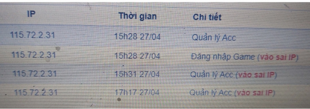 Chiều nay ac mình có bị 1 ip lạ đăng nhập và sử dụng một số chức năng ở web như rs nhân vật, mua time phòng Gold. Vào game phá pt , ăn lvtt ... Nếu như ac m buôn bán thì có thể mk dễ mò Nhưng đáng chú ý đây là ac chính của mình dùng để buôn bán , giao dịch mà vẫn mò đc thì ae nên cẩn thận. Góp ý cảnh báo cho ae cẩn thận Tiện thể ae nào rành tra giúp cái IP này nó ở đâu