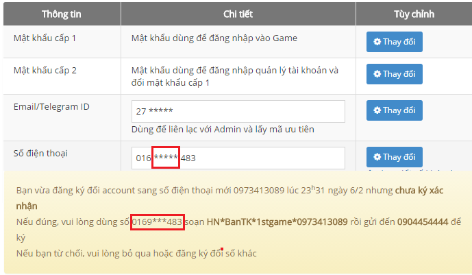 acc: Phungthais sdt: 0983xxx789 Nv: Gordel đã yêu cầu đổi sang sdt 0988xxx130 từ 18h chiều và nhiều lần nhắn tin theo cú pháp HN*BanTK*Phungthais*0988585130 .. gửi đến 0904454444 mà không đổi đc @fantasymc ol thì giúp em trường hợp này với ạ.. để em hoàn thành GD