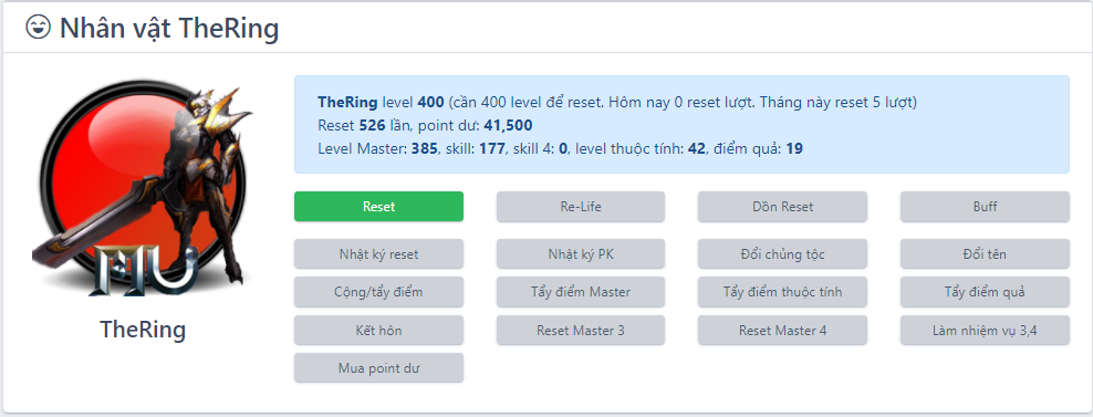 Level Master: 250, skill: 1,355, skill 4: 0, level thuộc tính: 51, điểm quả: 4,000