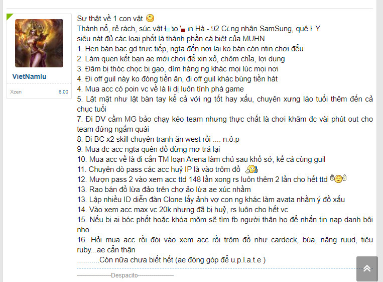 Ỏ xã hội này khôn thì sống, ngu thì chết. Kêu kêu cái lmm à (trích lời thầy Huấn) acc cắm 17k1 bán 20k chê đắt,rẻ. Huỷ thì kệ cmm. Đã ngu còn thích đánh đu với đời. Xong việc còn tỏ vẻ kể cẢ có đắt hơn 10k bạc cũng mua nếu tử tế