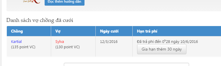 tài khoản của mình chơi từ tháng 1 tháng 2 năm 2016. sau đó vì bận việc mình nghỉ chơi 1 thời gian dài. nay quay lại chơi mà gia hạn kết hôn mấy lần vẫn không được. mong admin xem xét sớm gia hạn lại kết hôn và trả lại zen cho mình.