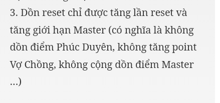 2. Bạn chỉ được dồn tối đa 90% số lần Reset của TOP 1 (Hiện tại TOP 1 = 269 lần reset). Nếu vượt quá sẽ tự động giảm.