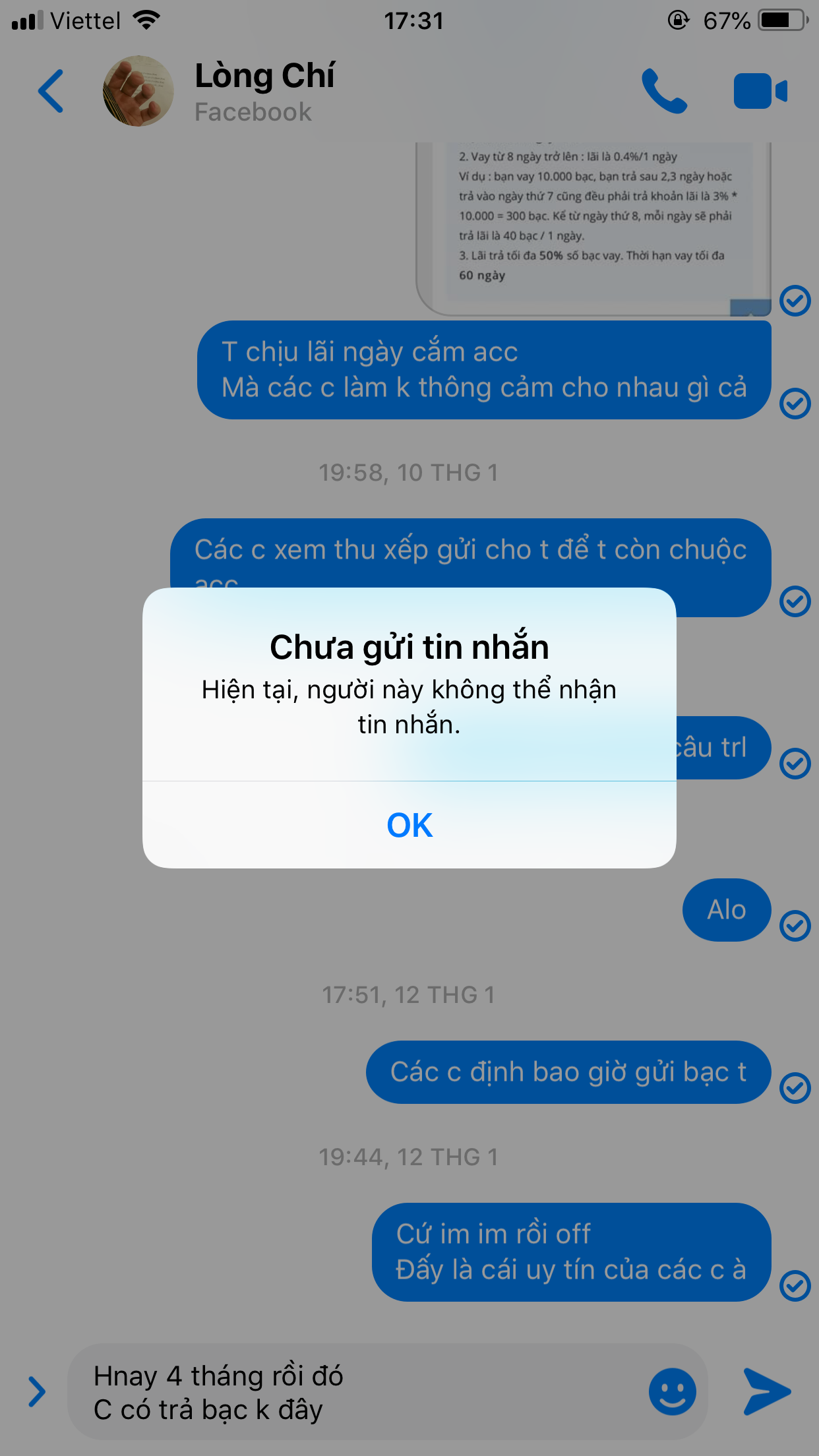 2. Thiếu bạc ( cụ thể 60.800 bạc ) từ tháng 11/2019 đến nay ( 25/2/2020 ) k hoàn trả. Sau rất nhiều lần hứa hẹn và lý do thì cái kết là chặn fb chặn sdt của tôi.