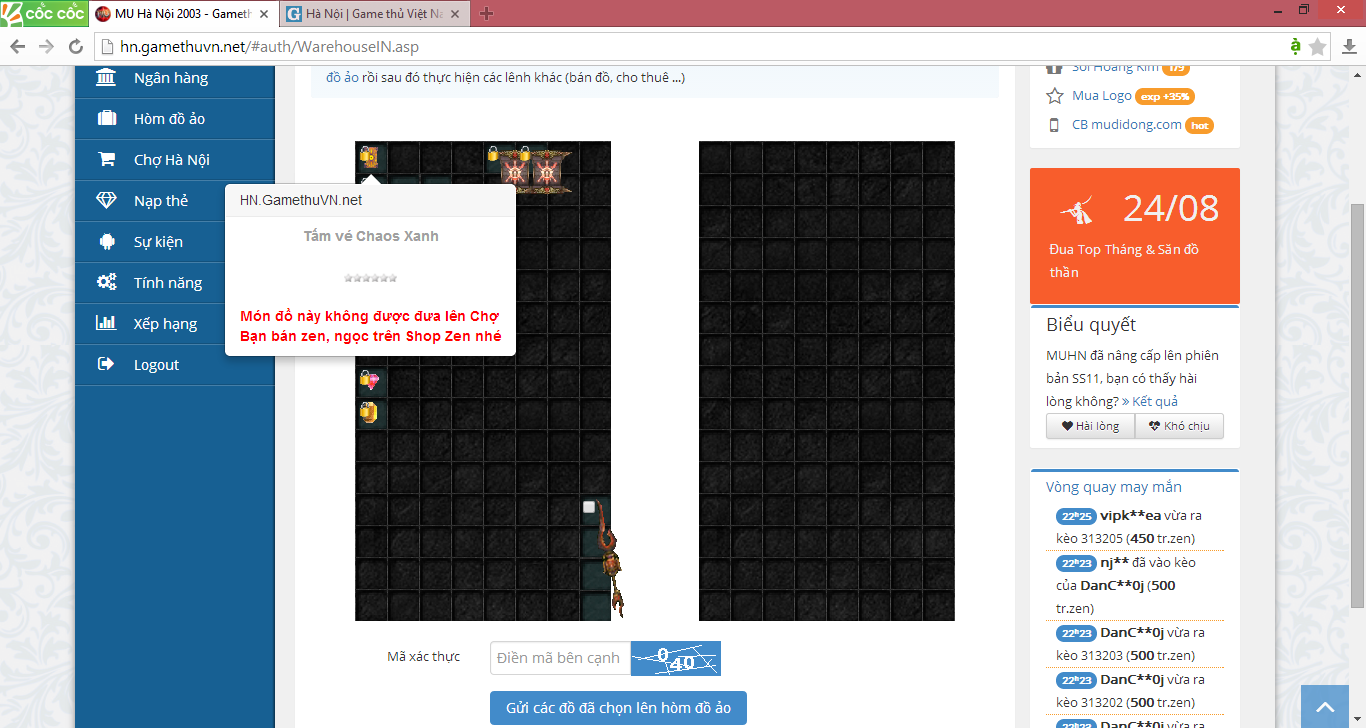 e chủ acc: tomorrow (char soul : tomorrow) (acc em mới mua) sđt : 0972694705 trong rương đồ của e có 1 vé chaos xanh ( như trong hình ) nhưng khi ở trong game thì ko nhìn thấy hiển thị mà chỉ nhìn thấy trên QLCC (hòm đồ ảo) vào game chỉ chuột vào vị trí hiển thị trên hòm đồ ảo thì ko thấy có gì (vị trí trống nhưng ko đặt đc đồ khác vào vị trí đó).... Mong BQT xem sét kiểm tra giúp e...e cảm ơn !!!!